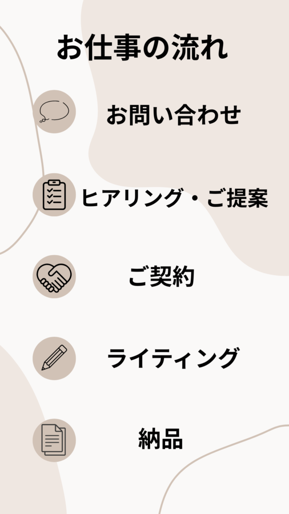 | STEP4|納品・修正対応 | 納品はWord・Googleドキュメント・WordPress入稿に対応しています。基本的に修正は2回まで対応可能です。 |